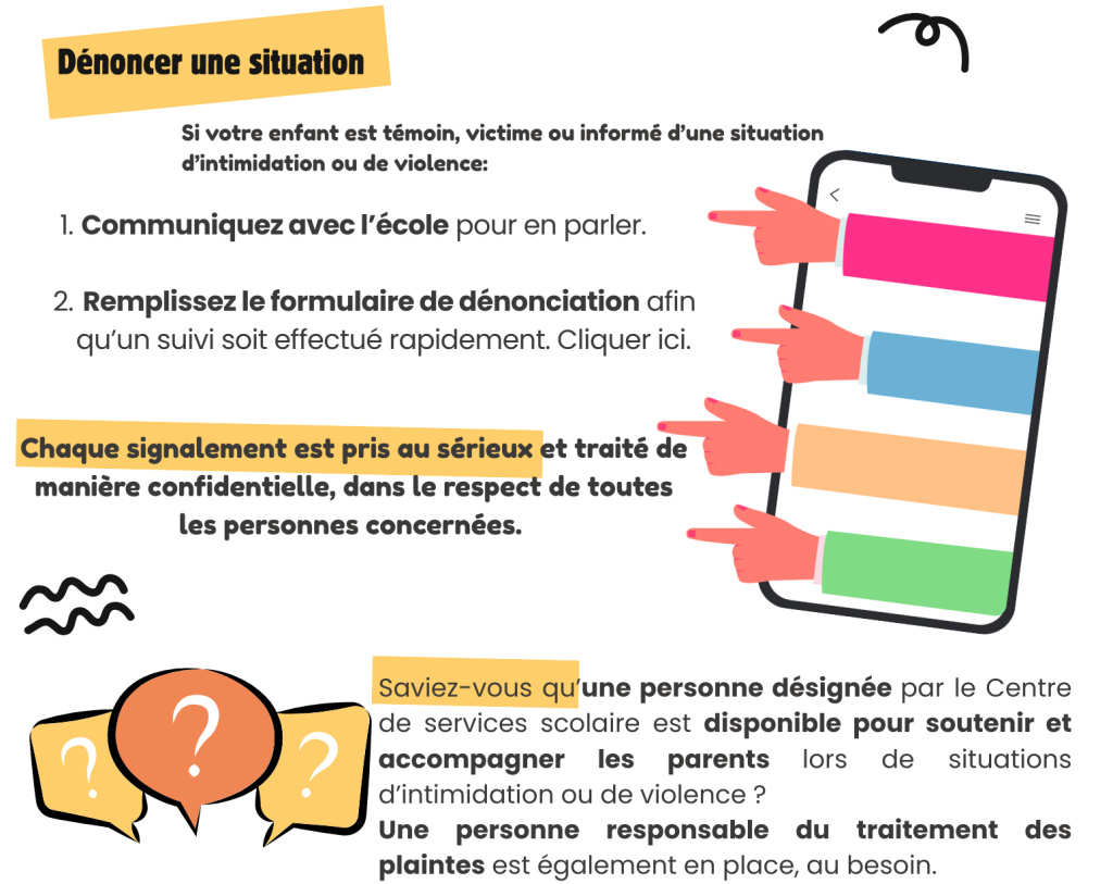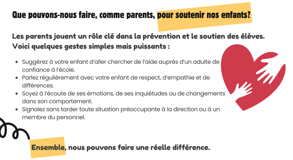 Nous avons à cœur d’offrir à chaque élève un milieu d’apprentissage sain, sécuritaire et respectueux. La prévention de l’intimidation et de la violence fait partie intégrante de notre mission éducative.